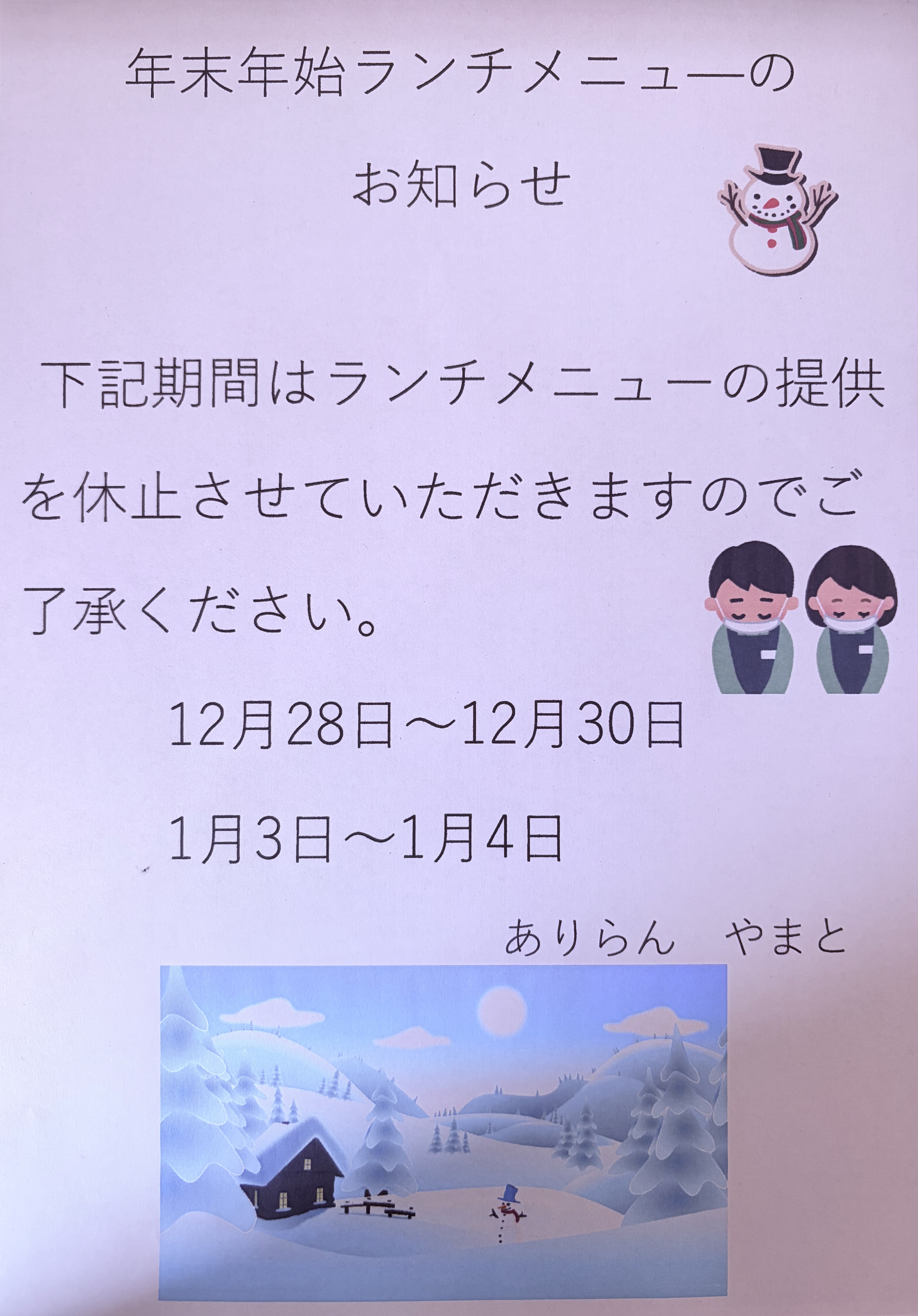※12月28~1月4日迄ランチメニューはございませんのでご了承くださいませ。